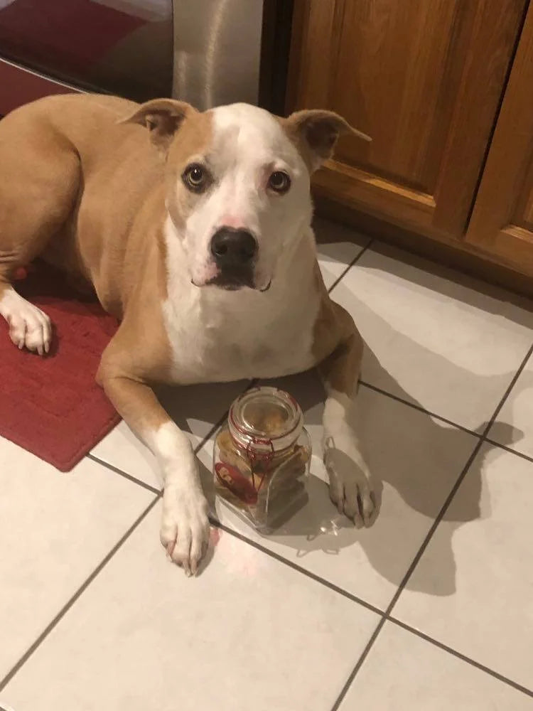 "My pit bull loves these dog treats! He sits at the counter by his cookie jar and cries for more treats!"